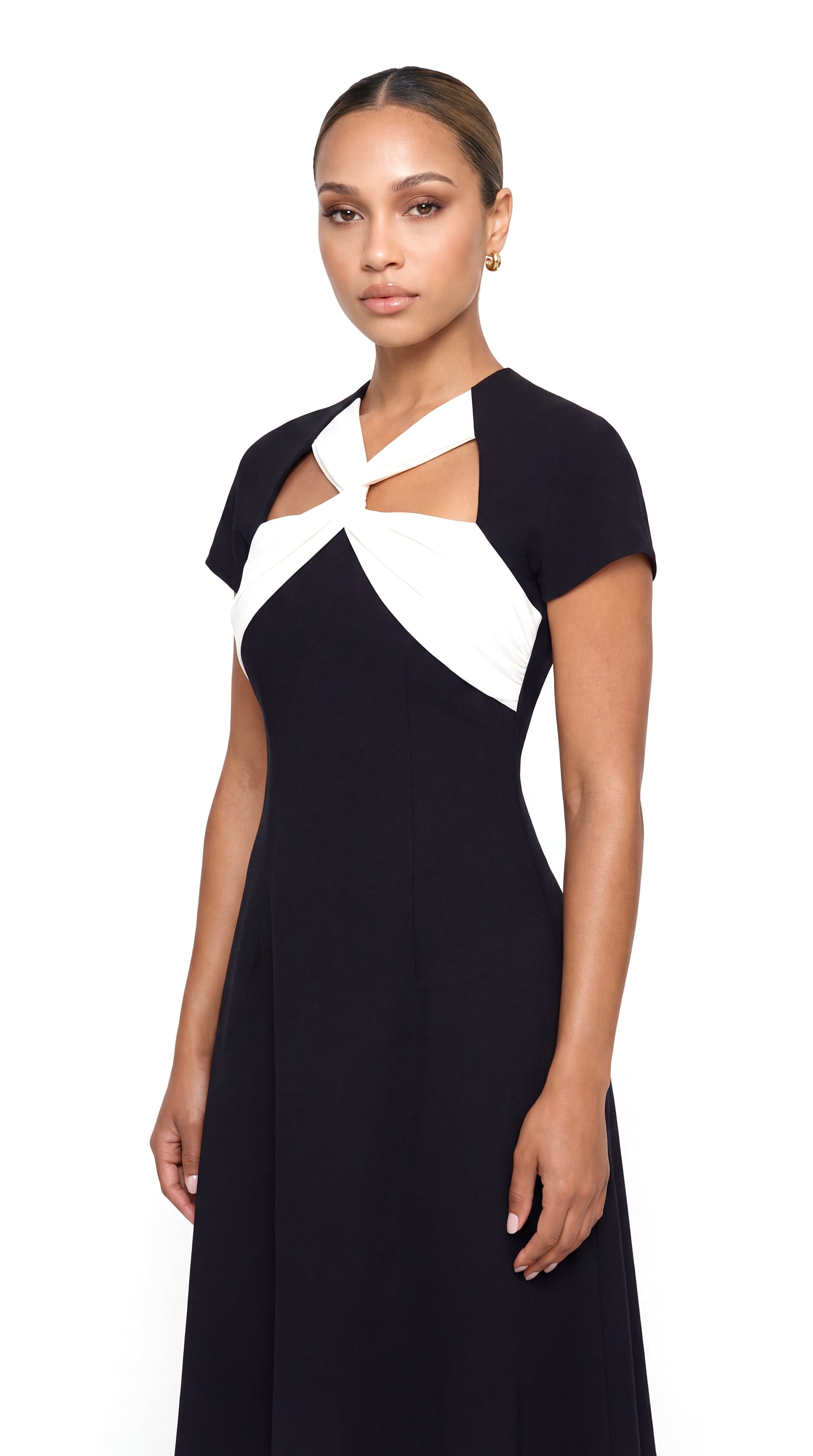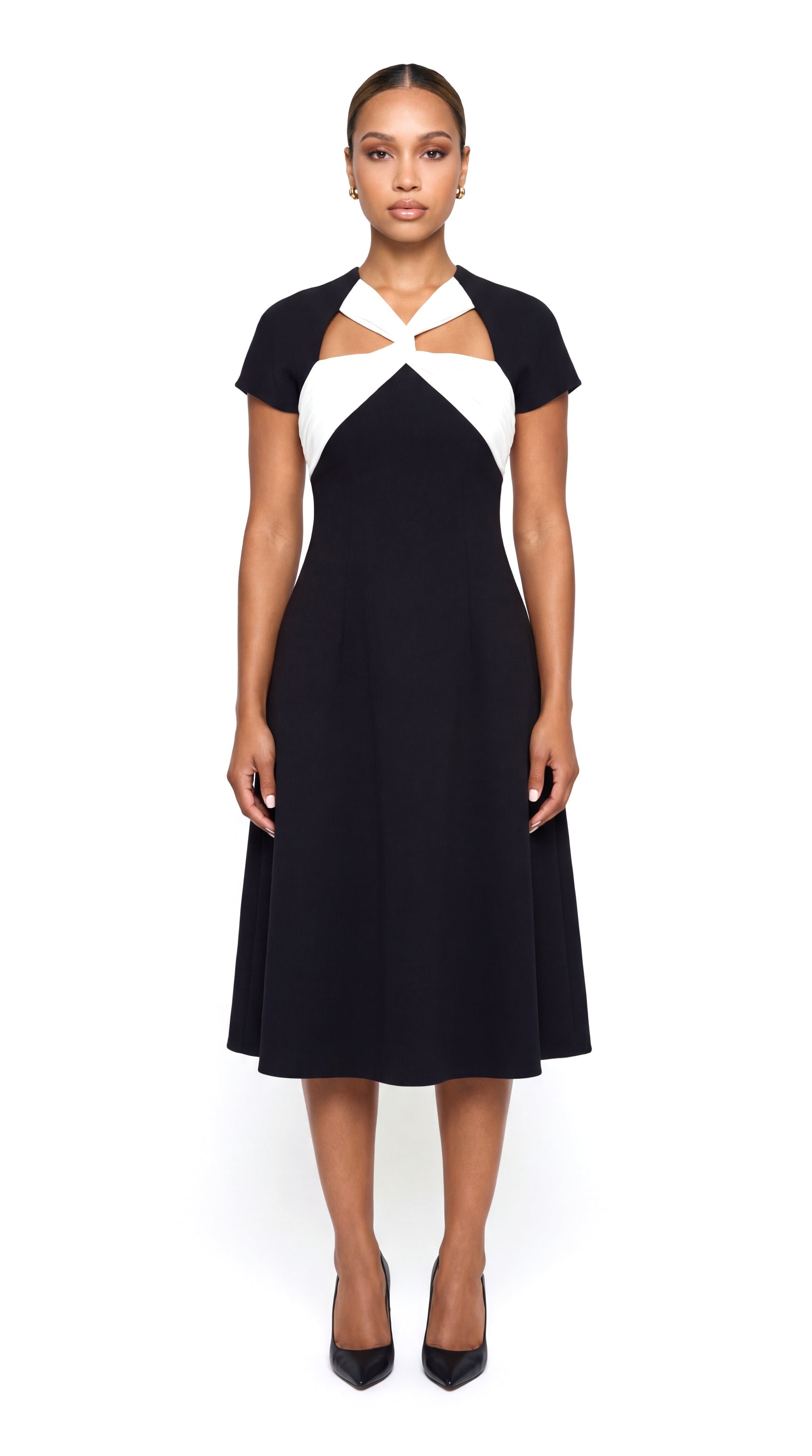 Step into sophistication with the 'Ayla' Dress, where timeless black meets a bold twist of modern design. This masterpiece features a striking criss-cross white accent, creating a contrast that exudes refined elegance. Perfect for formal occasions, professional settings, or special evenings, the 'Ayla' Dress is a statement of confidence and style.